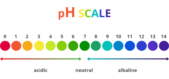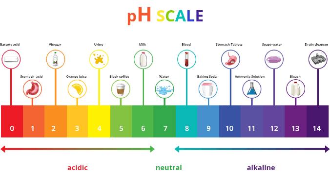 There are 14 points on the scale, and anything with a low concentration of hydrogen ions is acidic (rates 0-6) and a substance with a high concentration of hydrogen ions (8-14) is alkaline. A substance that rates a 7 on the scale is neutral.