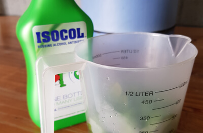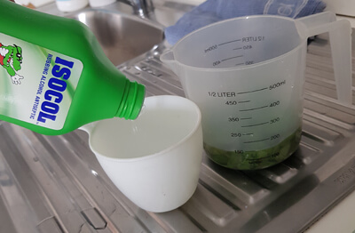 2. Place the basil leaves in a glass jug and pour boiling water on the leaves. Add the isocol, combining the mixture together.