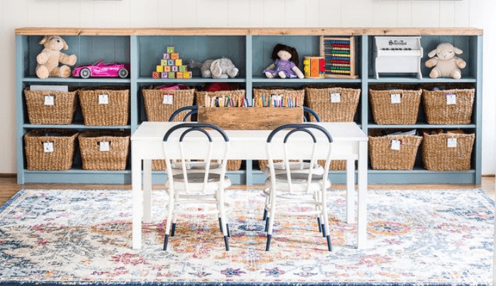 Leave some of your child’s favourite toys in the loungeroom, but put the rest away stored neatly in a room (like a basement or spare room) where you don’t have to see it often but is easily pulled out if wanted during playtime.