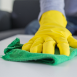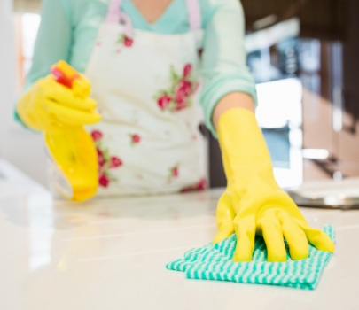9:00 Grab your pre-made vinegar spray and use this last minute to spray all of your surfaces down before wiping clean.