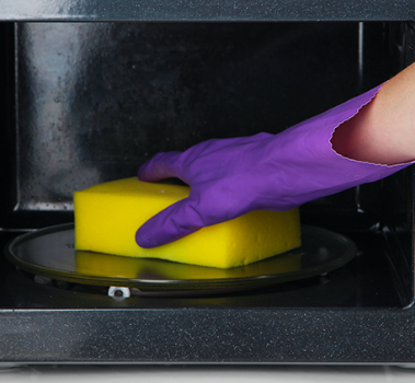 0:00 Sanitise your sponges by soaking them in water before putting them in the microwave for 2 minutes. Make sure you wait a further 2 minutes before getting them out.
