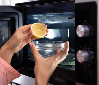 8:30 Use oven mitts or a tea towel while you’re taking your lemon/water bowl out of the microwave. Wipe the inside of the microwave down.