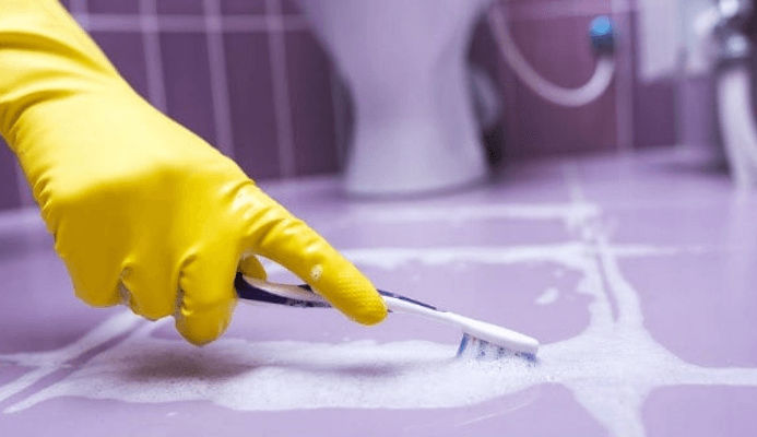 Mix 1/2 cup of baking soda, 1 small squirt of dishwashing detergent and 1 cup of water in a bowl to form a slightly runny paste. Place the paste on your dirty grout lines and let it sit for around 15-20 minutes. Use the toothbrush to give it a good scrub and then rinse/wipe off.