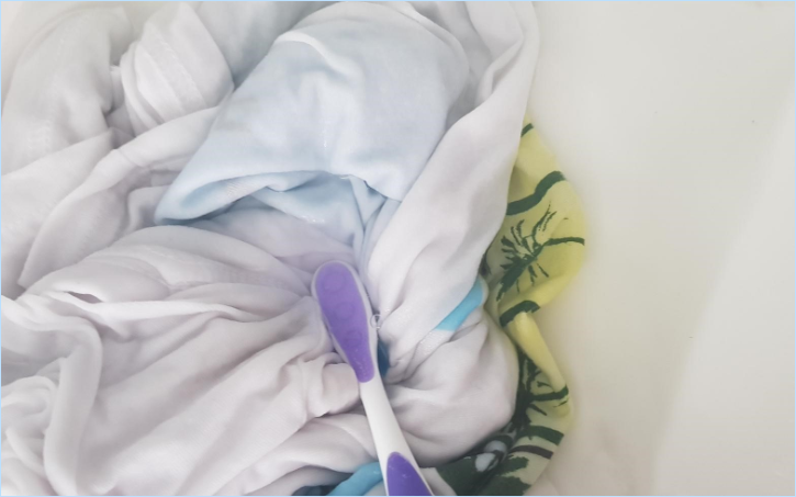 2 Use an old toothbrush to agitate the stain mid-soak to ensure that the vinegar is working properly. Pop the item into the machine for a normal load with other clothes.
